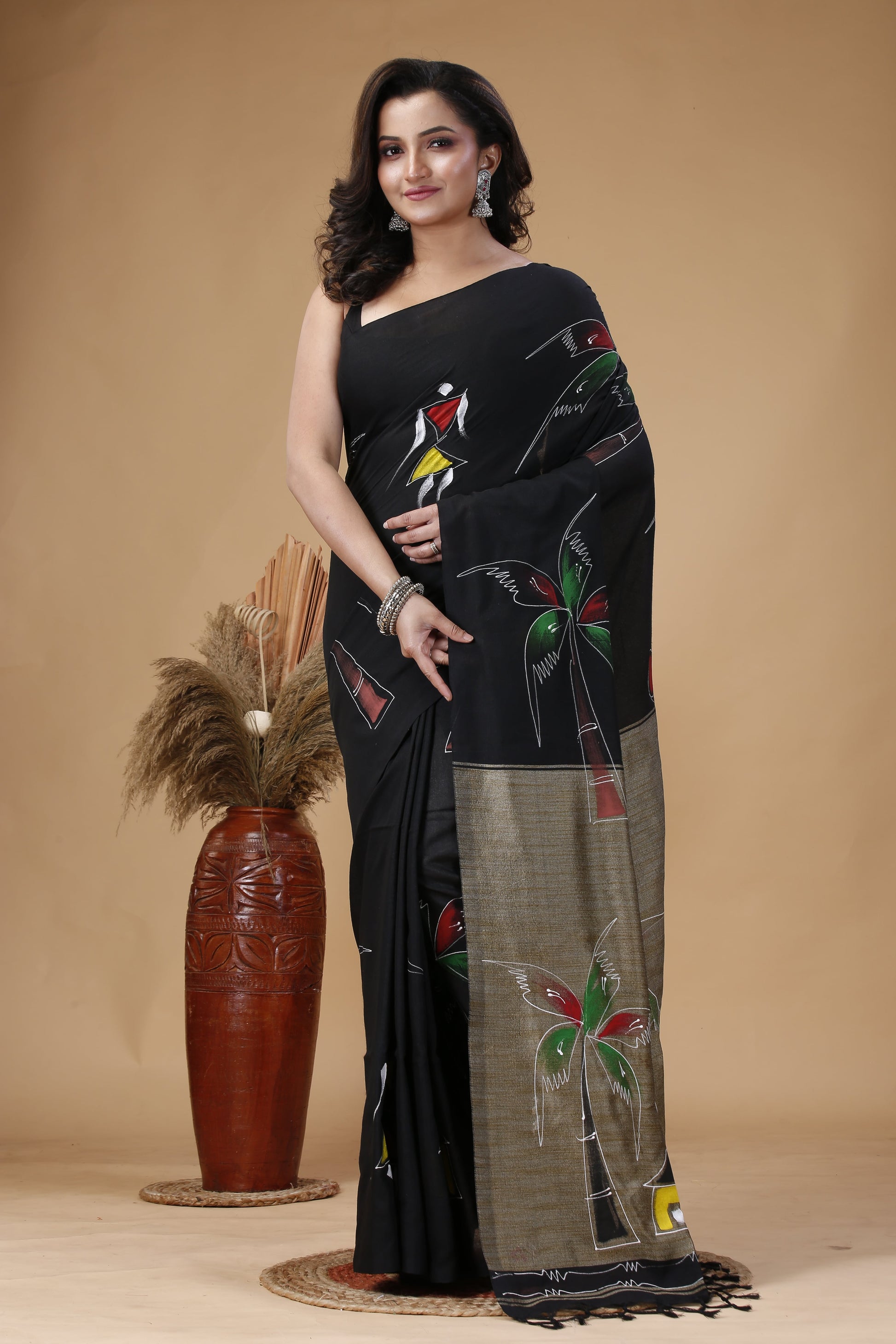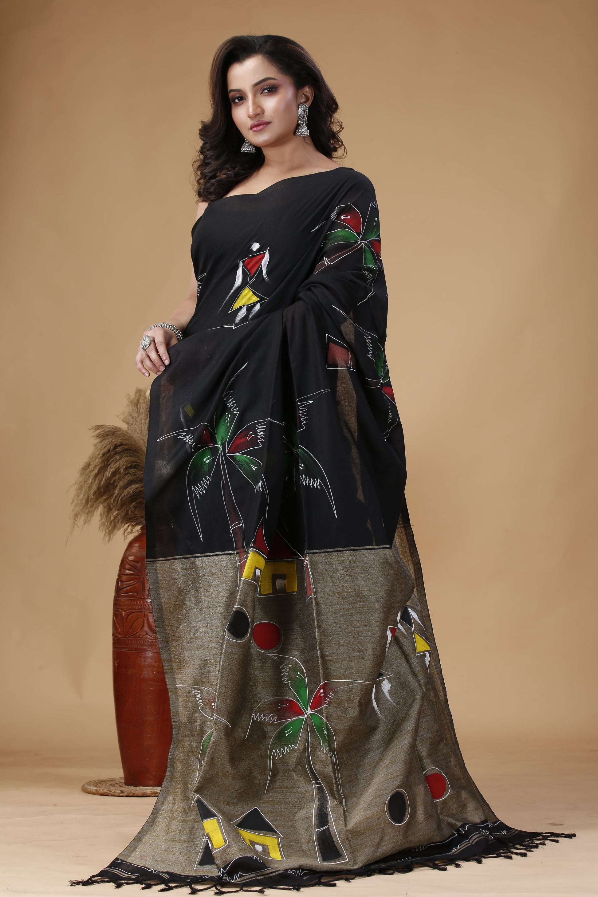 Hand Printed Khaadi Cotton Saree – Ghar Gach Theme from Bengal
