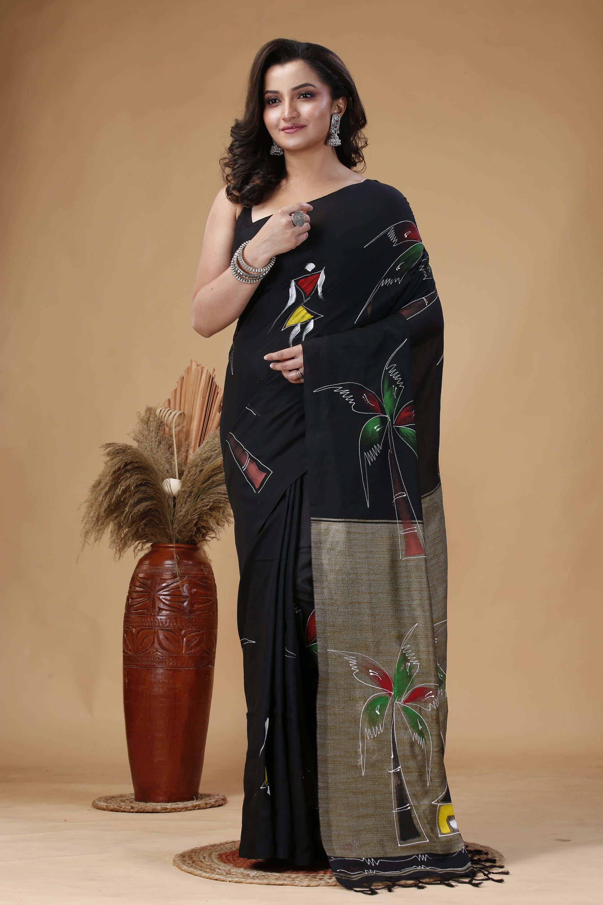 Discover the artistry of Bengal handloom with this Hand Printed Khaadi Saree featuring the symbolic Ghar Gach (tree of home) theme. Crafted with care on pure Khaadi cotton, this saree blends eco-friendly fabric with timeless motifs, making it ideal for both cultural occasions and everyday sophistication.