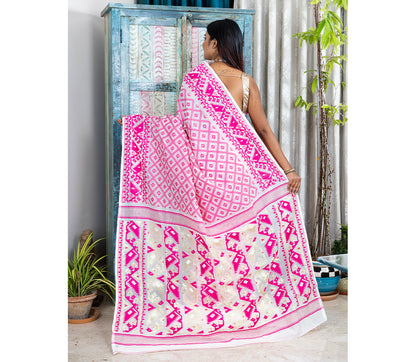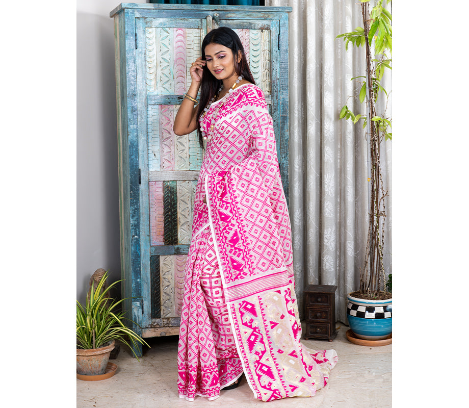 Handloom Jamdani Saree - Pink on White