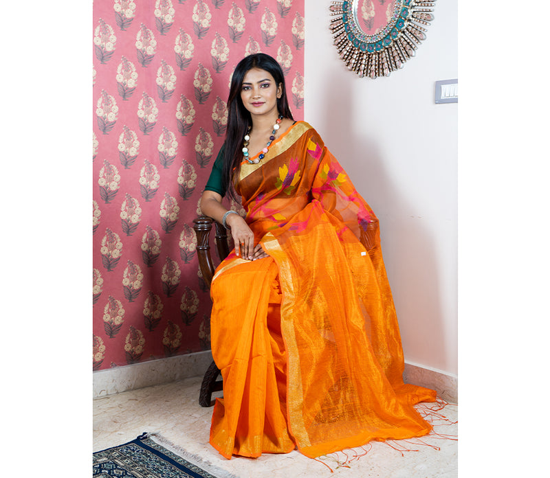 Handloom Muslin Silk Saree with Matka Paar - Orange With Leaf Design