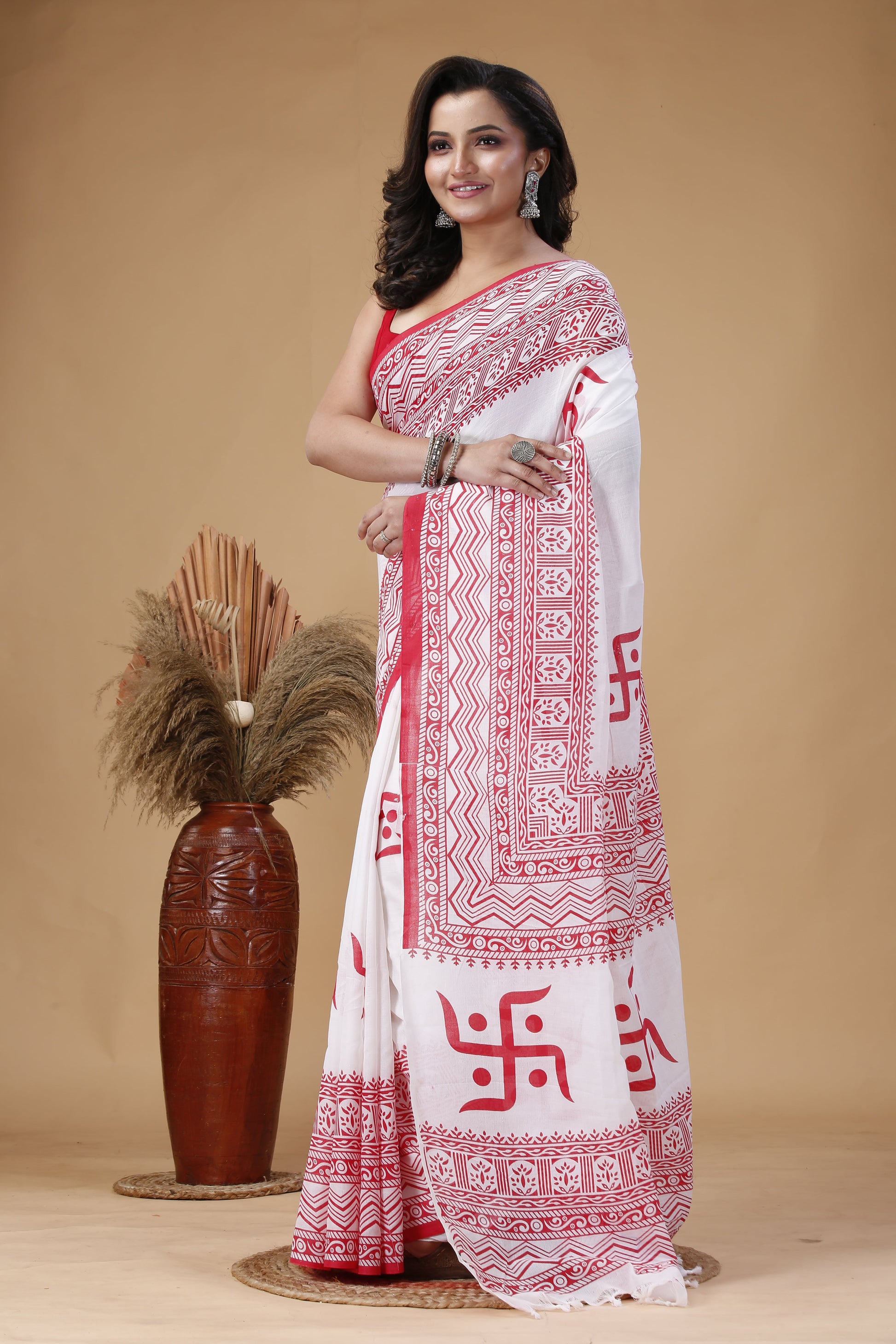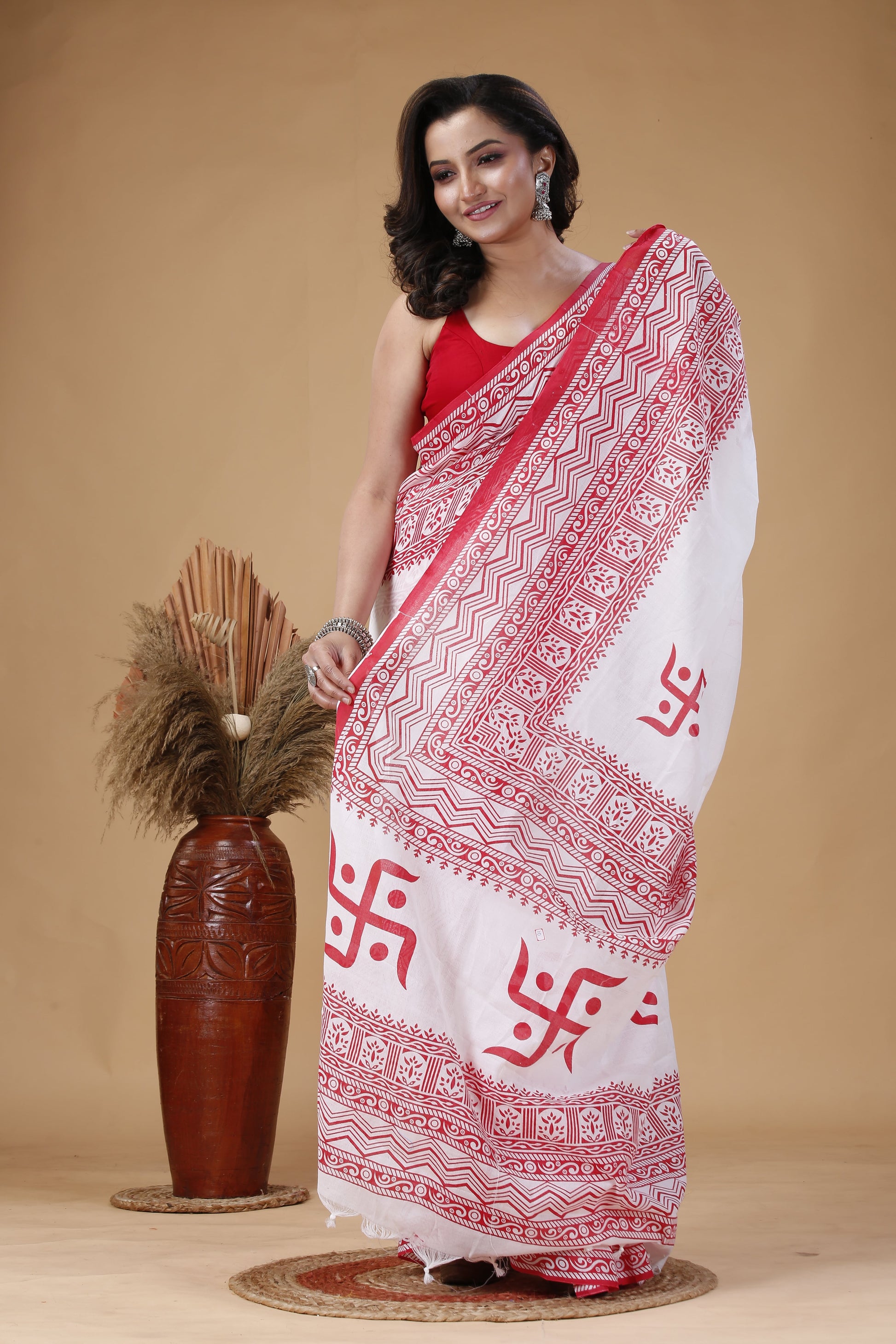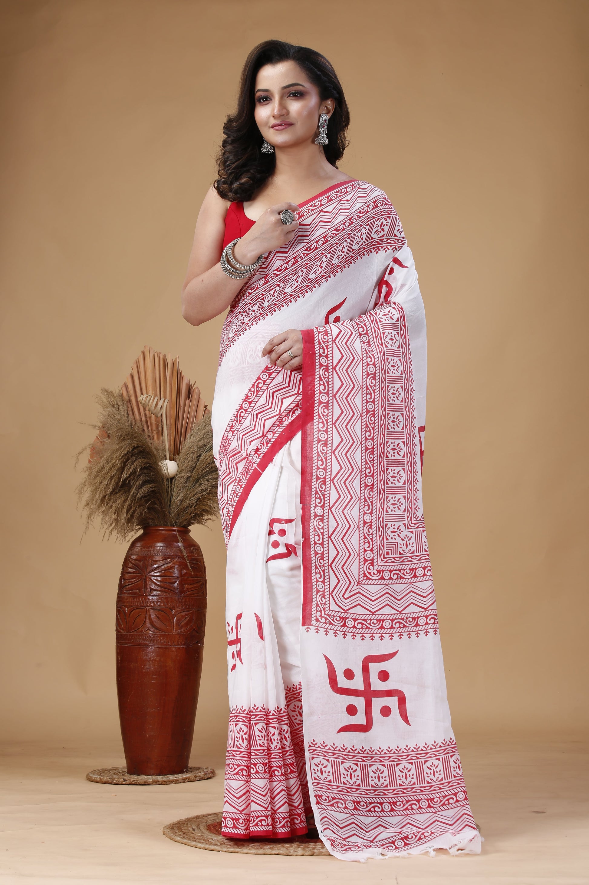The Swastika symbol has been a sacred motif in Indian culture for millennia, signifying auspicious beginnings and divine blessings. Sarees from Nadia, West Bengal, are cherished for their authentic weaving techniques that carry forward Bengal’s textile legacy. This saree is not just attire—it’s a cultural expression woven into fabric.